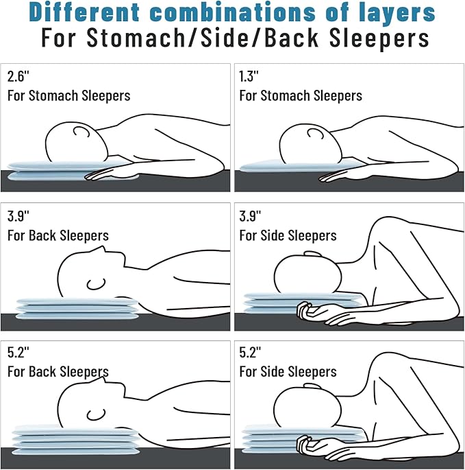- Adjustable Height Suit for All Sleepers: urnexttour's 24"*16" adjustable sandwich memory foam pillow has 4 layers, each layer is 1.3" high, you can customize the height to 1.3, 2.6, 3.9, or 5.2 inches according to your needs. Whether you like to sleep on your stomach, back or side, you can find a “just right” position to relieve your neck or back pain.