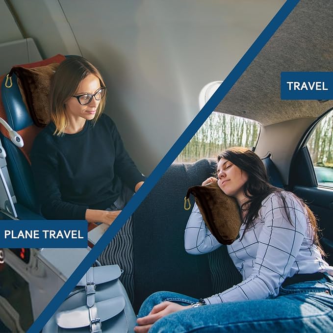 Bnuitland Travel Blanket and Pillow 2 in 1, Soft Flannel Airplane Blanket in Bag Compact-Long Flight Essential for Adults and Kids, Portable Luggage Sleeve and Backpack Clip, 65×40 inch Coffee Brown