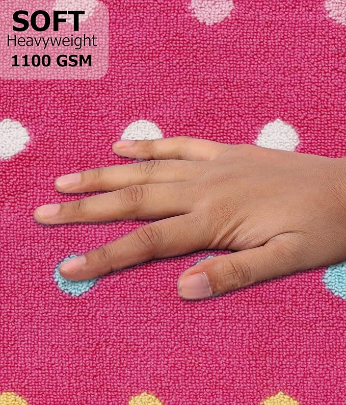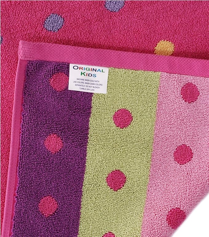- Functional & Reversible Bath Mat: Not only functional but also adorable, your little one will love this colorful multi-color polka dots and candy stripe design towel rug. In adorable pink and white base colors, these tub mats are adorned with cute multicolor dots on a pink base on one side, perfectly complemented by a reversible design featuring multicolor stripes on a white base on the other side. Your kids will enjoy the variety and fun this towel bathroom rug will bring to their bath time.