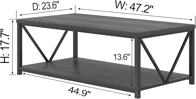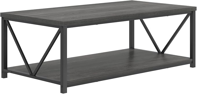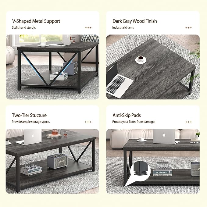 - Modern Coffee Table: Featuring a dark gray wood grain finish and sleek black V-shaped metal side frames, this coffee tables for living room perfectly blend rustic charm with contemporary and industrial design elements, making it a nice centerpiece for any stylish space.