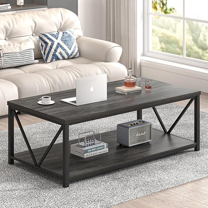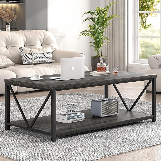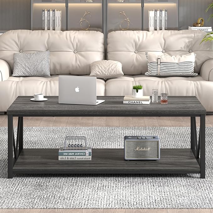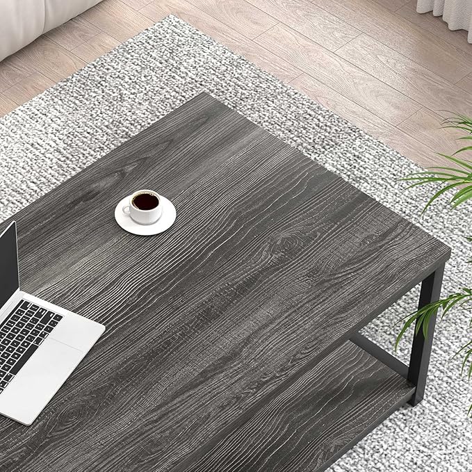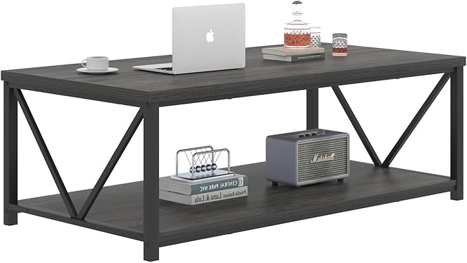 FOLUBAN Industrial Coffee Table with Storage Shelf, Modern Rustic Wooden and Metal Rectangle Center Table for Living Room, Dark Gray, 47 Inch