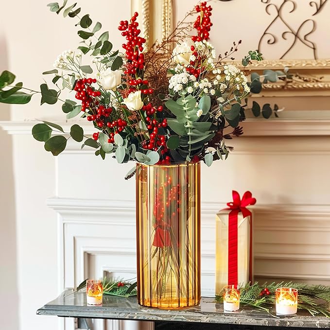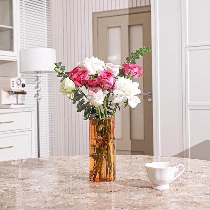 ComSaf Glass Cylinder Vases, Bud Vase for Centerpieces, 8 Inch Tall Ribbed Vase Hurricane Floating Candle Holder, Decorative Flower Vases for Wedding Reception, Home Decor, Housewarming Gift (Amber)