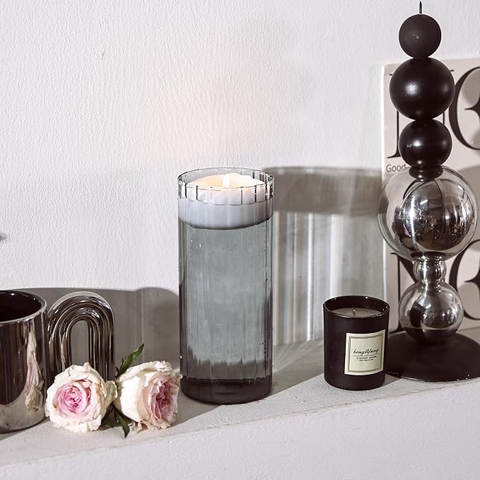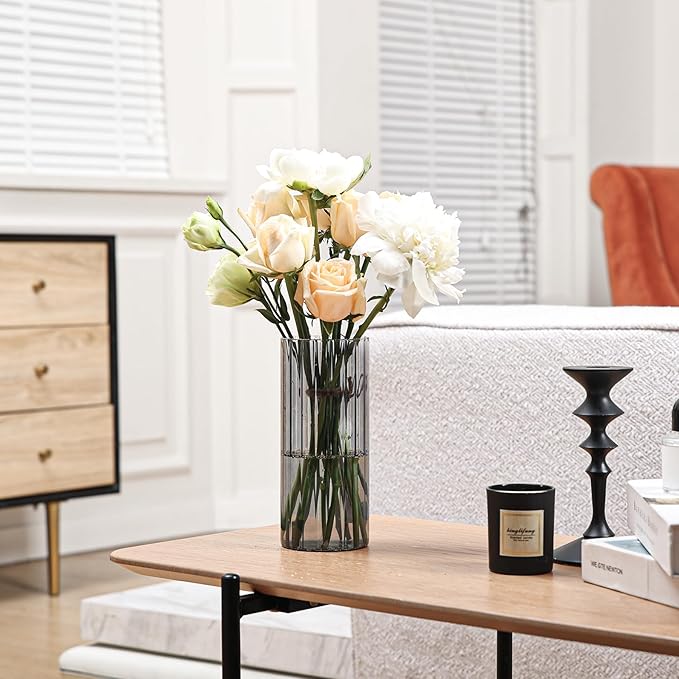 ComSaf Glass Cylinder Vases, Bud Vase for Centerpieces, 8 Inch Tall Ribbed Vase Hurricane Floating Candle Holder, Decorative Flower Vases for Wedding Reception, Home Decor, Housewarming Gift (Grey)