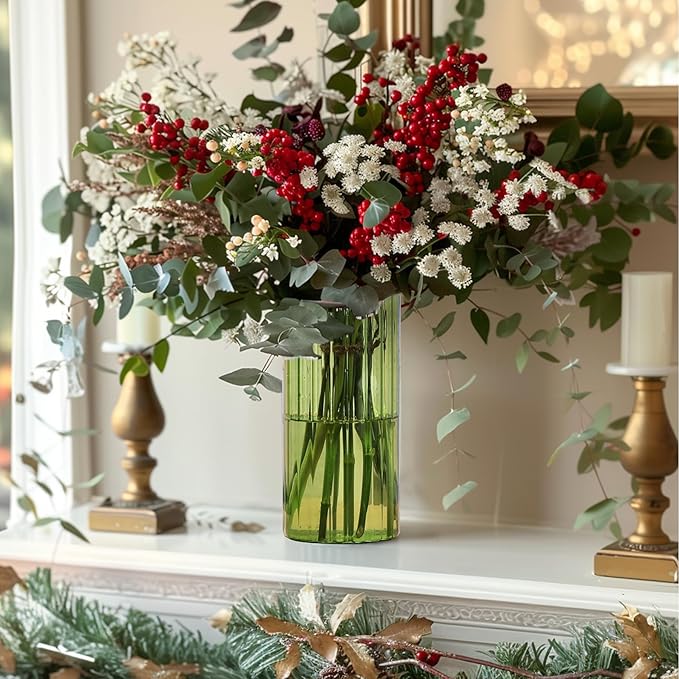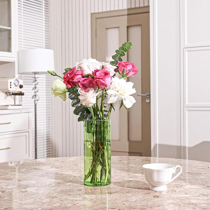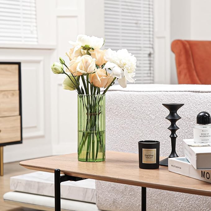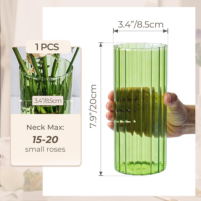 ComSaf Glass Cylinder Vases, Bud Vase for Centerpieces, 8 Inch Tall Ribbed Vase Hurricane Floating Candle Holder, Decorative Flower Vases for Wedding Reception, Home Decor, Housewarming Gift (Green)
