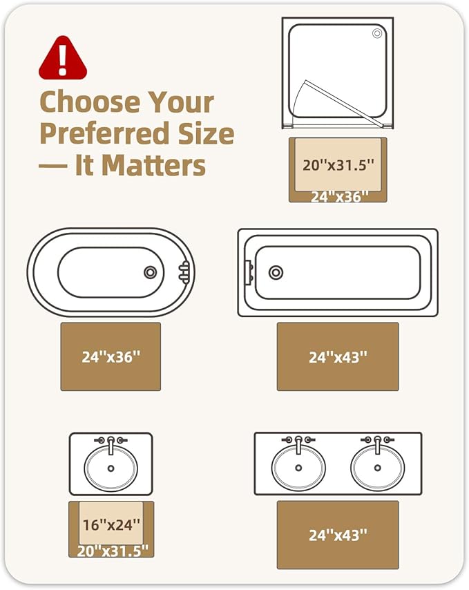 - Stylish and Practical: Available in a range of colors and with a simple design, this shower mat not only serves its functional purpose but also complements bathroom decor nicely, adding a touch of style to your space; having several sizes to choose from, standard, large or runner, you can easily find a perfect size to fit in front of the single or double sinks, showers, bathtubs, vanities and more