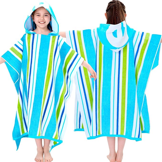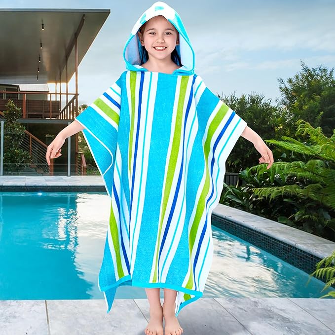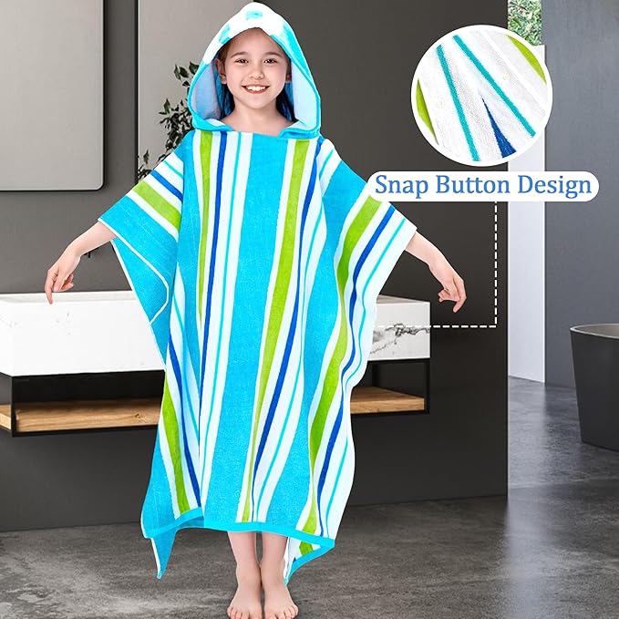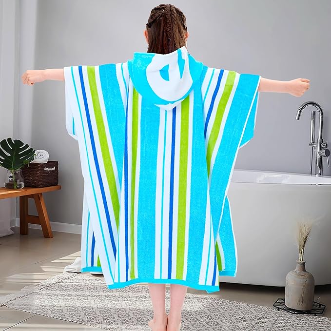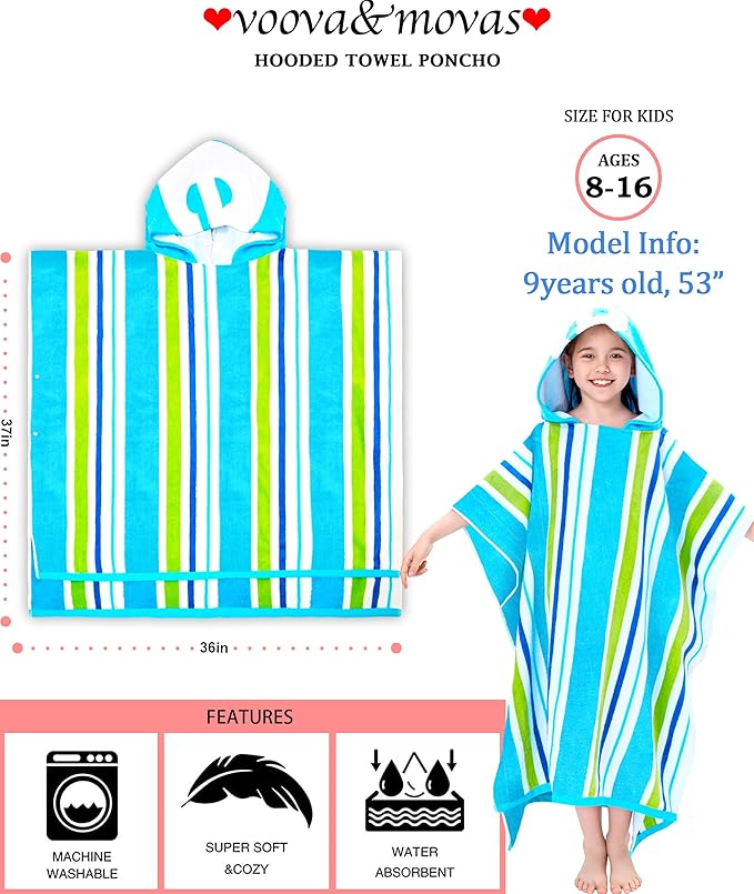 VOOVA & MOVAS Big Kids Towel Poncho with Hood (8-16Years), 100% Cotton Thick Poncho Towel Robe for Kids, Perfect for Pool, Beach, Bathroom, Blue Green Stripe