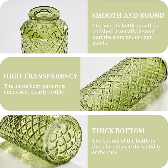 - 🍀【THICKENED MATERIAL】These charming small vases are made of thick and sturdy glass, durable and unbreakable. The patterned finish gives them. a textured look and sparkles in the light. Simply insert a flower stem and fill with water, stones or colored gems.