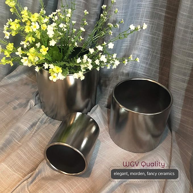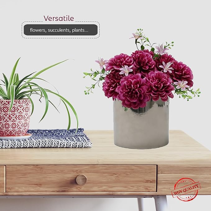WGVI Silver Ceramic Cylinder Vase Width 5.5" Height 5", Flower Arrangements, Candle Holder, Terrarium Planter Pot, Storage Container Organizer, Pen Brush Holder, Smooth Silver Tabletop Decor, 6 Pc