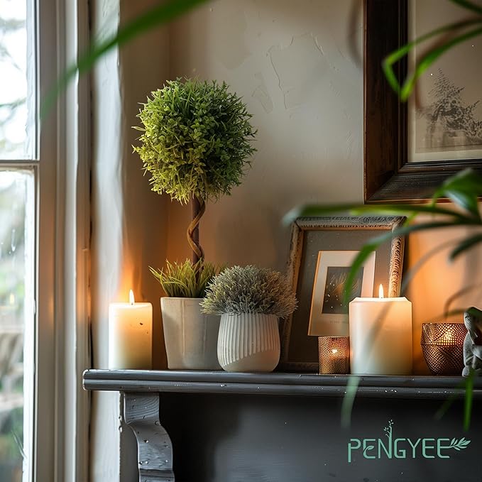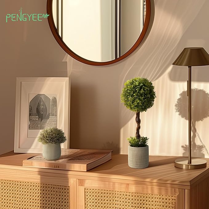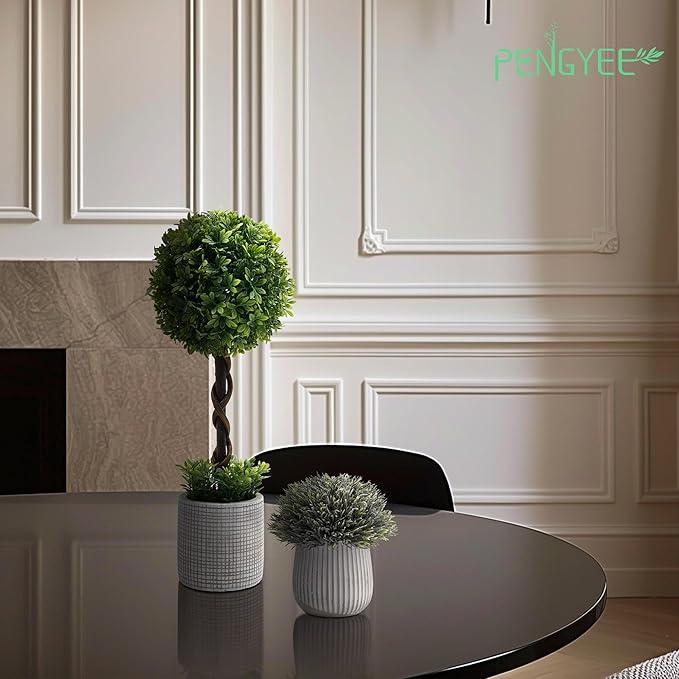 - UNIQUE DESIGN : The PENGYEE 3 pack small faux boxwoods for outdoor that are in three assorted cement planter. The concrete ceramic pots with both traditional art characteristics and modern aesthetic charms, simple but fresh, more elegant in appearance and better in quality. This small faux topiary outdoor/ indoor arranged together or separately, will add a natural, earthy touch to any space