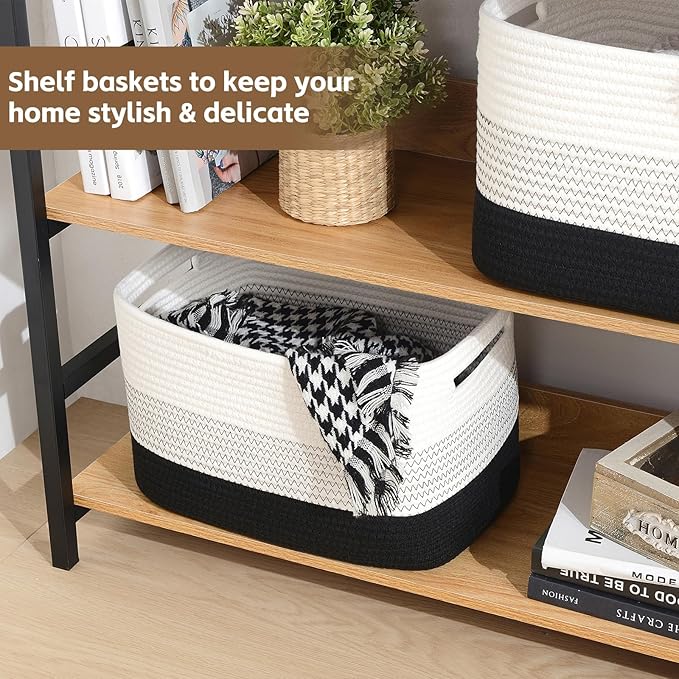 Cotton Rope Storage Basket, Woven Basket for Organizing, Rectangle Decorative Baskets for Shleves, Books, Toys, Towel Baskets for Bathroom - Pack of 3 (Gradient Dark)