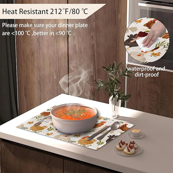 Cute Roosters Chickens Hen Placemats Set of 6, Waterproof Non-Slip Washable Table Mats Set for Kitchen Dining Holiday Party Wedding Decor 12x18 Inch