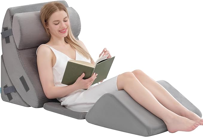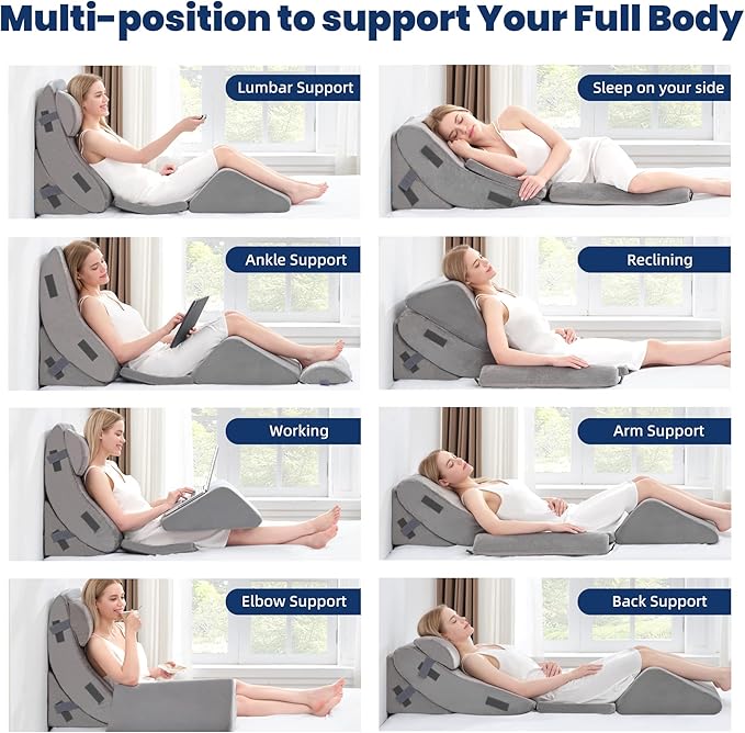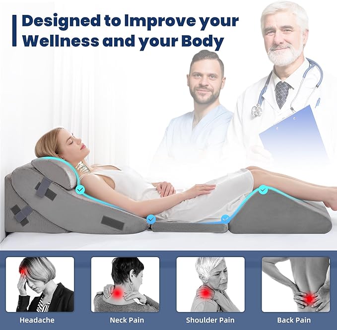 - Premium Gel Memory Foam Comfort: All wedge pillows feature high density and better rebound memory foam.Includes a back pillow and head pillow made from soft, gel-infused memory foam for prolonged comfort. Seat pillows and knee pillows crafted from high-density foam provide robust support and maintain their shape over time.