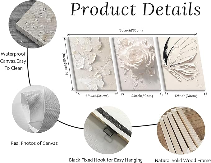 - Pink White Butterfly Canvas Wall Art Size:12×16 inch×3pcs(30×40cm×3pcs).