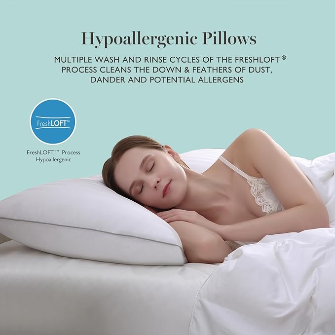 - 【Safety Certified】- Multiple wash and rinse cycles of the FreshLOFT process cleans the down and feathers of dust, dander and potential allergens. Experience peace of mind with our Oeko-Tex certified pillows, ensuring they meet stringent standards for safety, sustainability, and environmental responsibility.