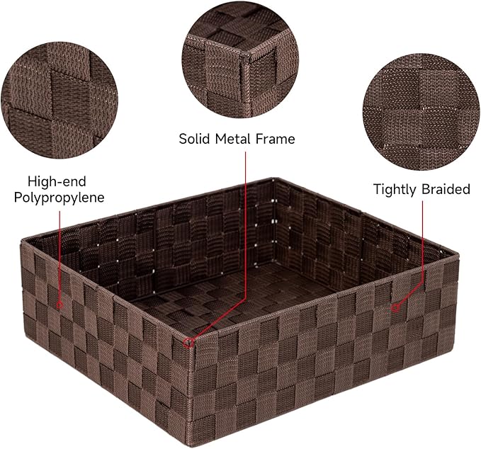- Good Material: The woven baskets are made of Polypropylene Webbing with stainless steel frame. The solid construction and metal frames give the basket strength to hold clothes, linens, toys or pantry items without breaking down over time. Wipe clean with a damp cloth if any spills or dirt occur - maintain neat storage areas with low effort.
