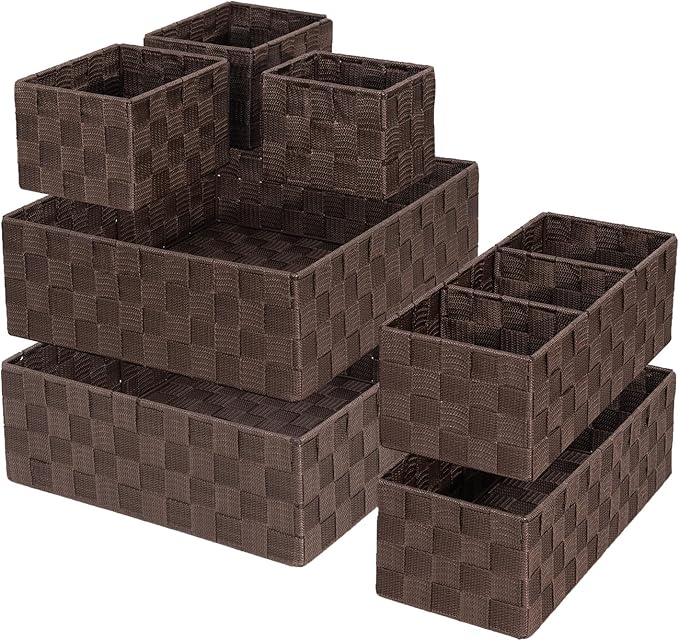 Drawer Organizer, Cube Baskets for Storage Shelves, Handmade Small Woven Basket, Shallow Storage Bins for Organizing Desk, Dresser, Kitchen, Pantry, Nested 7 Pack, Brown
