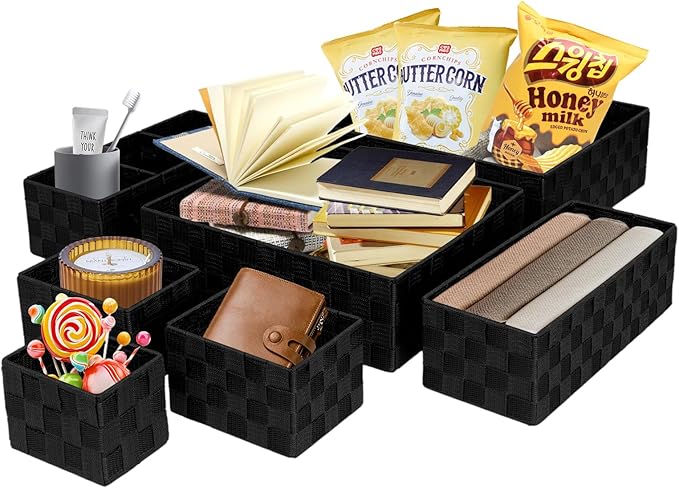 Drawer Organizer, Cube Baskets for Storage Shelves, Handmade Small Woven Basket, Shallow Storage Bins for Organizing Desk, Dresser, Kitchen, Pantry, Nested 7 Pack, Black
