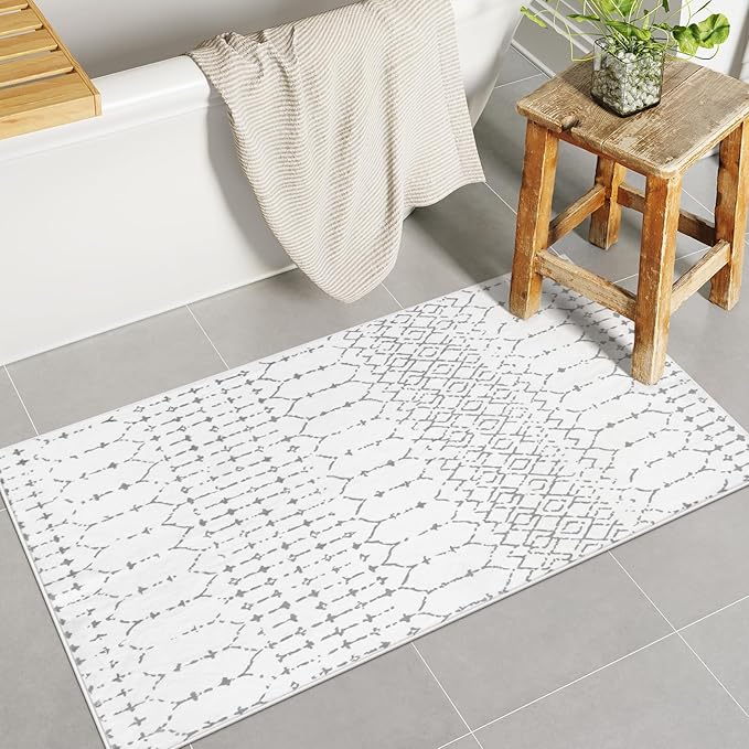 Lahome Moroccan Runner Rug for Hallway - 2x4 Rug Washable Non-Slip Small Carpet Runner Lightweight Throw Rubber Back Bath Carpet, Geometric Print Mat for Kitchen Entryway Bedroom (White, 2'x4')