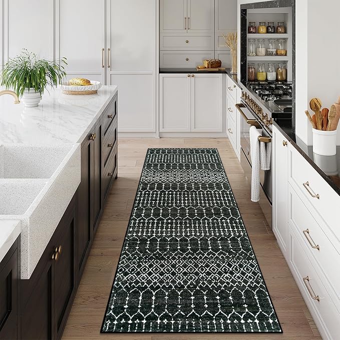 Lahome Moroccan Runner Rugs for Hallway 2x10, Long Kitchen Rugs Runner Washable Ultra-Thin Non Slip Carpet, Soft Modern Geometric Print Carpet for Entryway Stair (Black, 2'x10')