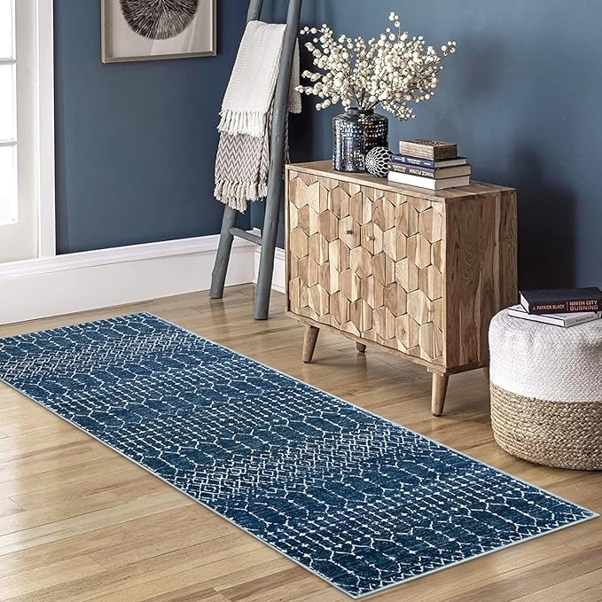 Lahome Moroccan 2x5 Washable Blue Runner Rug, Non-Slip Low-Pile Stain Resistant Kitchen Rugs, Geometric Soft Bathroom Runner Carpet for Entrance Bedroom Laundry (Blue,2'x5')