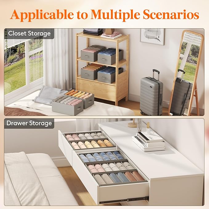 - Large Capacity: These closet organizers offer ample storage space with dimensions of 16.5''x10.6''x6.7''(42x27x17cm) and 6 compartments. Each compartment spans 2.8"(7cm) wide, facilitating seamless organization and classification of pants, jeans, T-shirts, sweaters, towel, leggings and more.