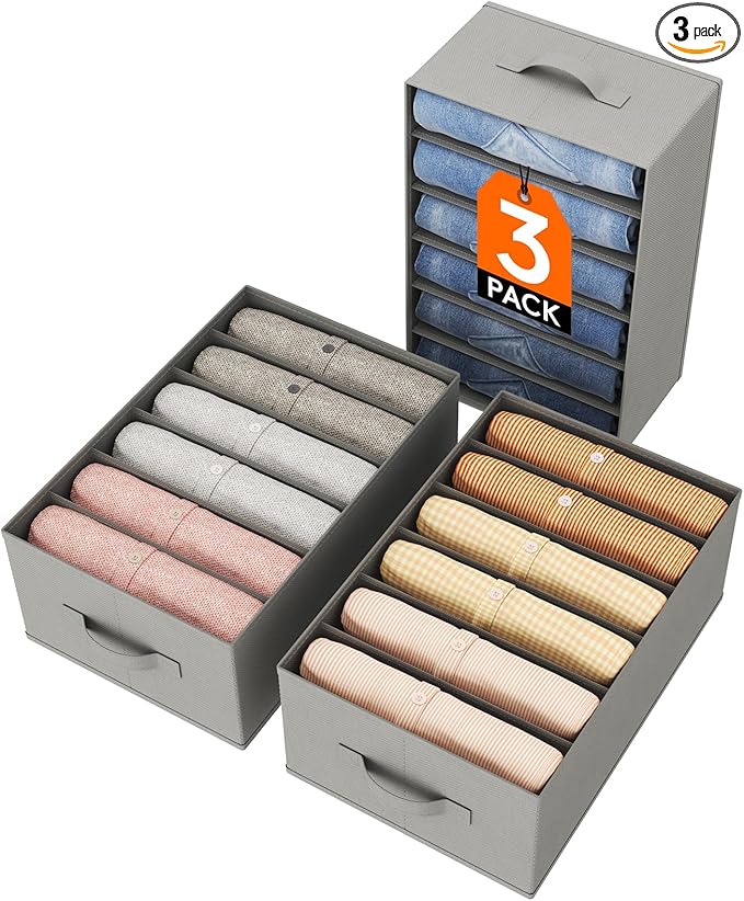 Lifewit Wardrobe Clothes Organizer 3 Pack, Large Size 6 Grids Closet Jean Storage Bins with Handles and Support Boards, Foldable Drawer Dividers for Sweater, Pants, T-shirt, Hoodie, Dress, Grey