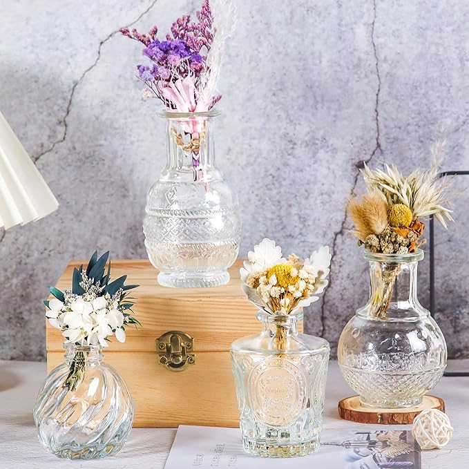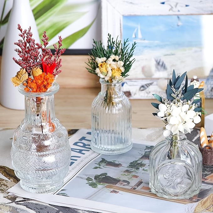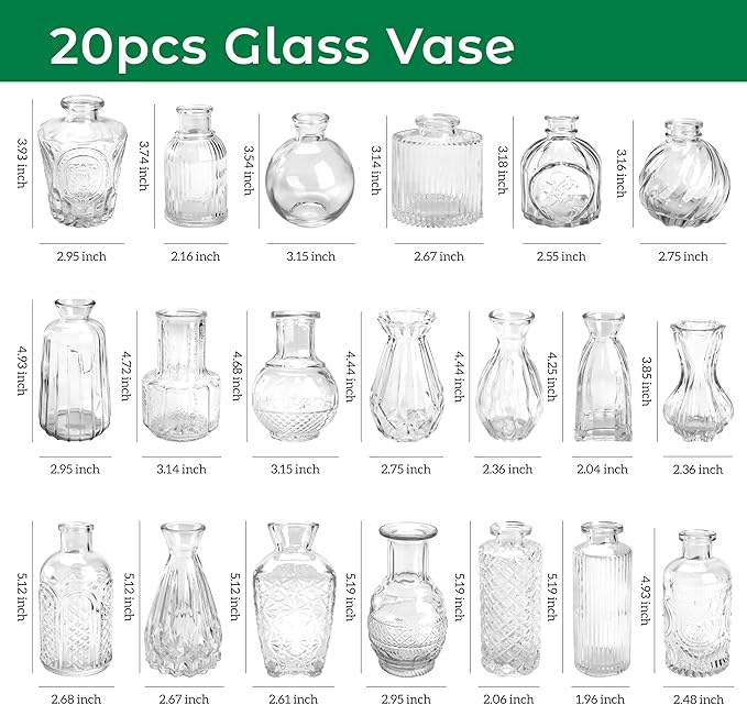 - Vintage Style: You will receive 20 clear glass bud vases. Each flower vase for centerpieces has different sizes and patterns, which can easily combine flowers or decorations according to your ideas