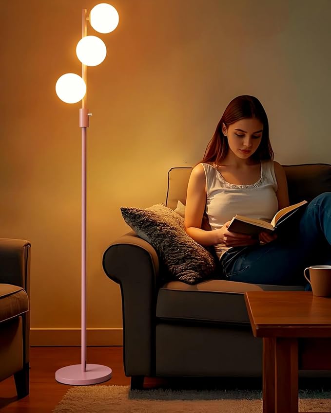 64IN Dimmable Pink Floor Lamp, Tall Standing Lamps with 3 Globe Soft Warm White Eye Care 3000K G9 Bulbs, Mid Century Modern Floor Lamp for Bedroom Office