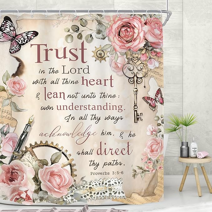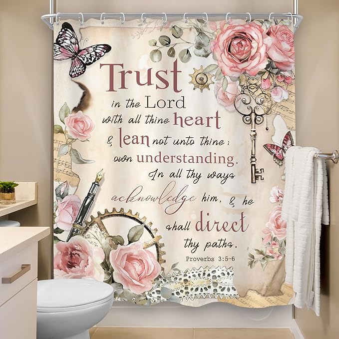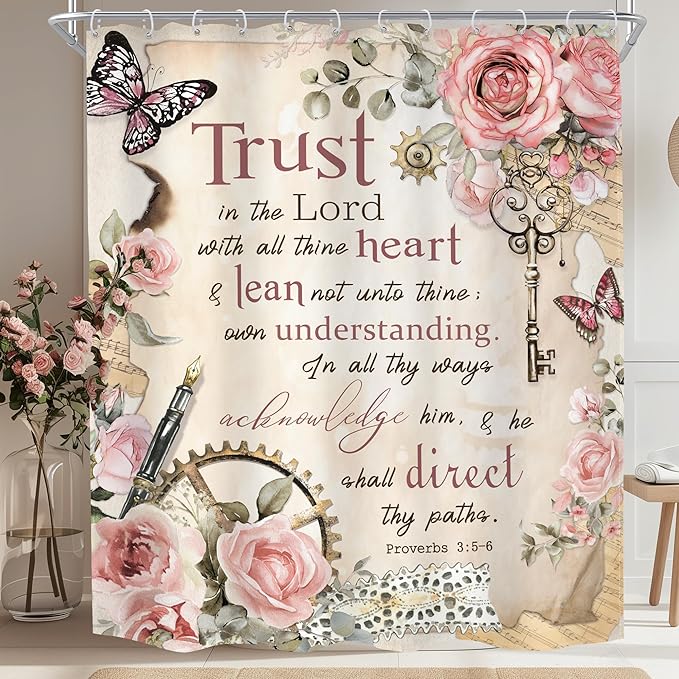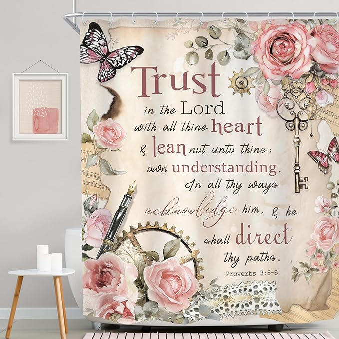 MESHELLY Vintage Pink Christian Shower Curtain 60Wx72H Retro Floral Bible Verse Bathroom Curtain Scripture Bath Curtain Fabric Rustic Flower Butterfly Quotes Bathroom Accessories Decor with 12 Hooks