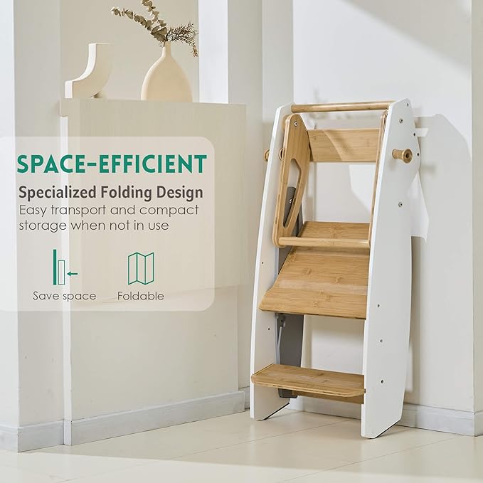 Toddler Tower Foldable Kids Kitchen Step Stool, Folding Learning Tower for Toddlers with Safty Rail, Montessori Standing Tower with 3 Adjustable Heights, Natural Bamboo, White