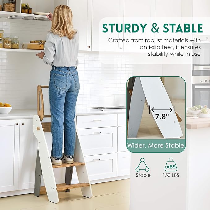 - 【Children-Safe Design】Our foldable toddler standing tower, crafted from premium materials for safety, features a sturdy “A” frame with non-slip pads, a wider standing board, an enclosing safety rail that prevents falls and can be lifted for easy entry, and easy-grip, splinter-free handles. CPC-certified and constructed to high standards, it guarantees security and peace of mind, empowering your child to embark on their journey towards independence with confidence.