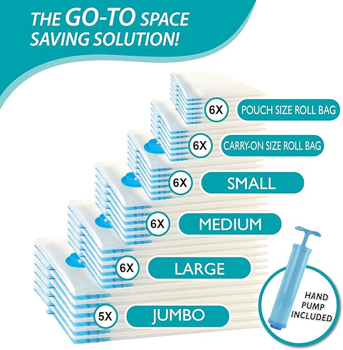 - 35 PACK INCLUDES: 5 Jumbo: 39.35” X 27.5”(100cm X 70cm); 6 Large: 33.5” X 21.65”(85cm X 55cm); 6 Medium: 27.5”X 19.5”(70cm X 50cm); 6 Small: 23.5”X 15.7” (60cm X 40cm); 6 Travel Roll Up (No need vacuum holes): 23.5”X 15.7” (60cm X 40cm);6 Pouch Sized Travel Roll Up (No need vacuum holes)