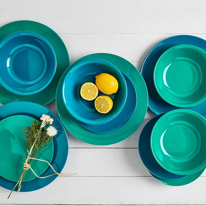 Tabletops Gallery 12 Piece Green Blue Melamine Dinnerware Set Plates Bowls for Indoor Outdoor Use, Service for 4, Tropical