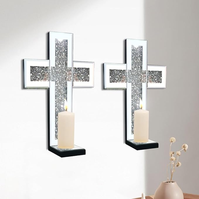 Crystal Crush Diamond Mirrored Candle Sconces, Silver Wall Candle Holder Set of 2, Wall Decoration for Living Room,Dining Room (Silver Cross)