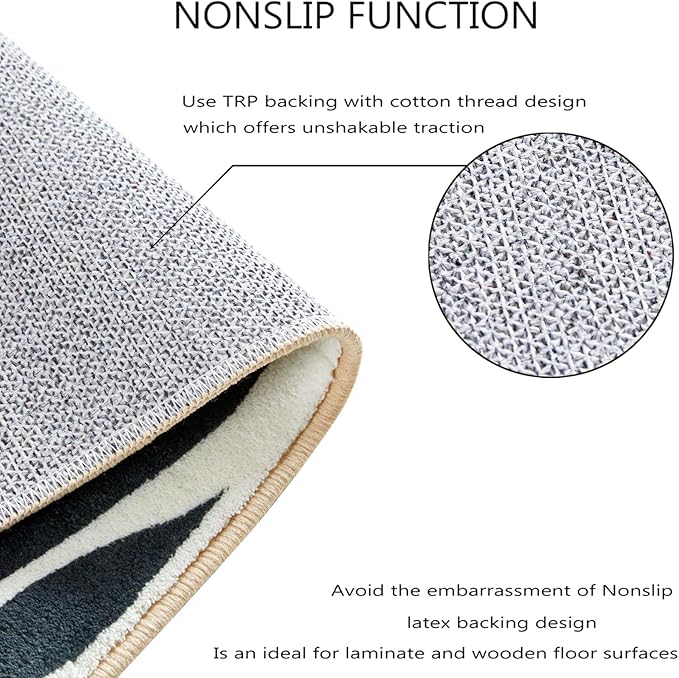 - [NON SLIP TPR BACKING] -- The non-slip TPR backing prevents slipping, tripping and holds the aesthetic accent rug more firmly in place. This neutral rug used upgraded material makes mat odor-free and protect your floors from moisture and scratches