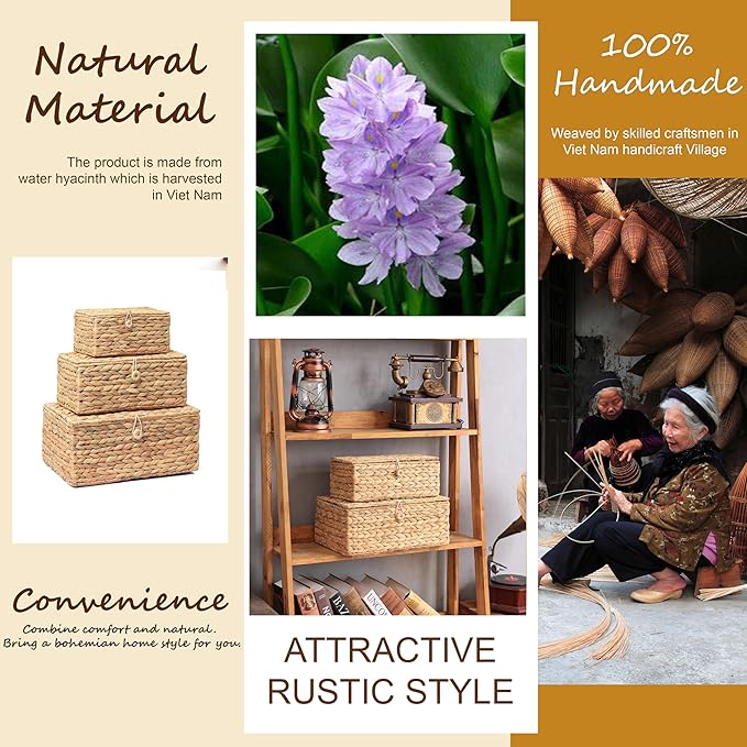 - 🧡 【Detail】: Rattan basket with lids is handmade by skilled craftsmen using material 100% natural water hyacinth, so each storage bins with lids is unique. This decorative rattan boxes is made of rattan, which is sturdy, durable and beautiful, and can withstand a certain weight and is not easily deformed.