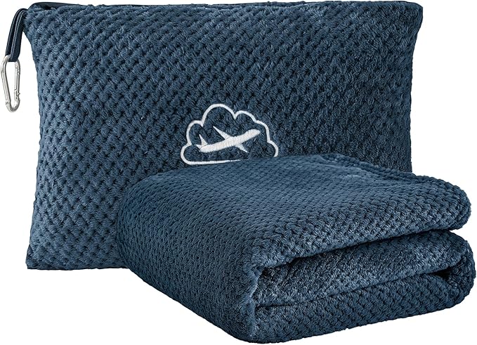 BEDELITE Travel Blanket Airplane Compact with Bag, Portable and Packable 2 in 1 Travel Pillow and Blanket Set, Airplane Blanket Travel Essentials with Luggage Sleeve & Backpack Clip, Navy Blue