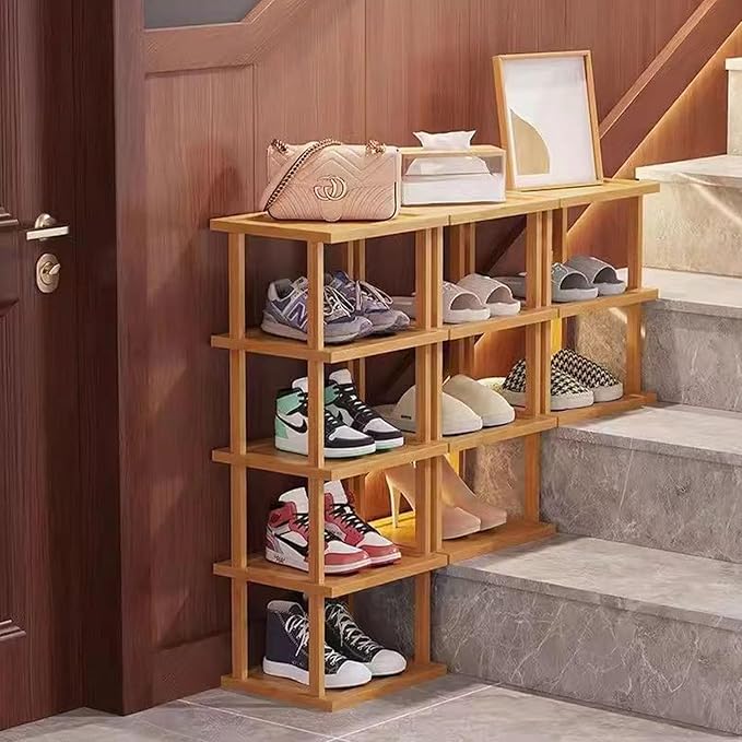 - - Space-saving solution: Our bamboo shoe rack is perfect for small spaces, featuring a 17-tier vertical design that stands tall and fits in a corner.You can also design layers according to your own space and stack them freely. DIY can be placed under the table in the wardrobe, or used as a storage rack or bookshelf, making your home no longer messy.