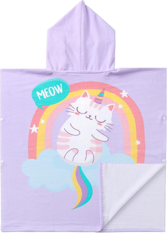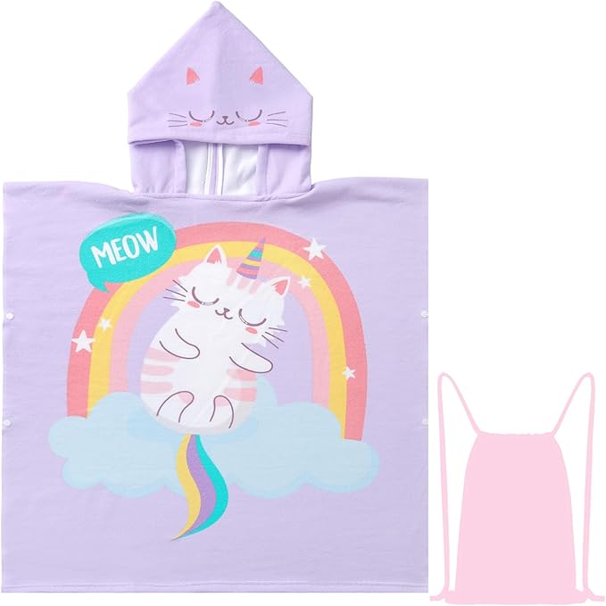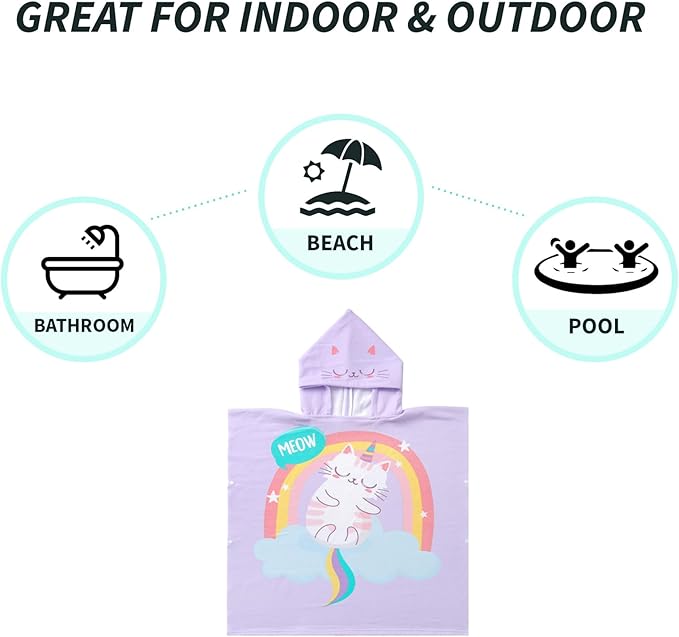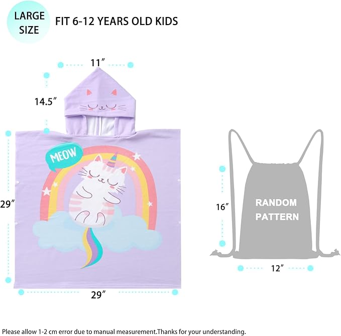 - SIZE: The kids hooded beach pool towel poncho measures 29.5"x29.5" in length with a 13.7x13.7" hood. This baby beach bath towels with hood is large enough for growing toddlers and kids(6-12 years old) or anyone under 60 inch girls boys.