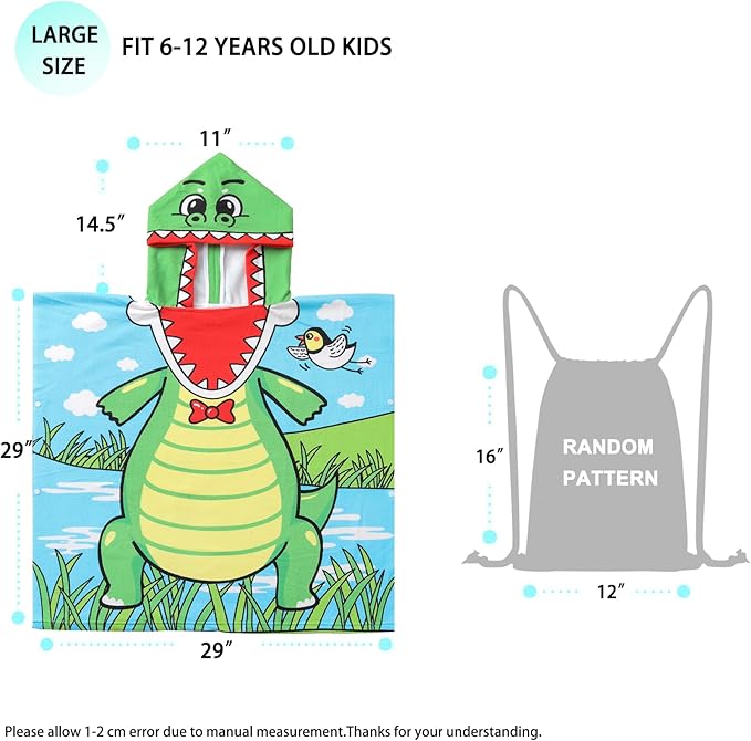 - SIZE: The kids hooded beach pool towel poncho measures 29.5"x29.5" in length with a 13.7x13.7" hood. This baby beach bath towels with hood is large enough for growing toddlers and kids(6-12 years old) or anyone under 60 inch girls boys.