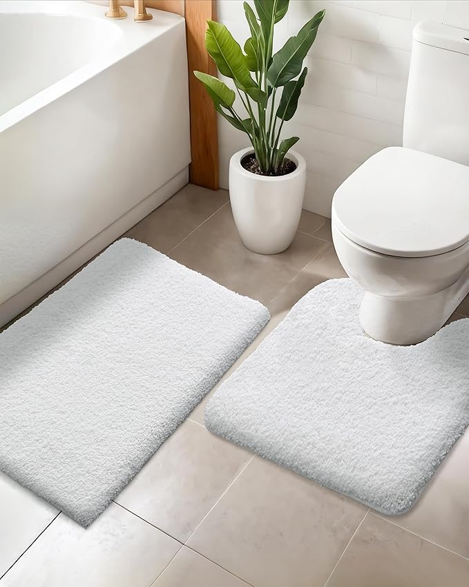 ILANGO 2 Piece Bathroom Rugs Bath Mat Set, Dries Quickly,Non Slip Fluffy Shaggy Bath Washable Mats with U-Shaped Toilet Rug Set for Bathroom,Tub,Toilet (White,17" x 24" + 22" x 24")