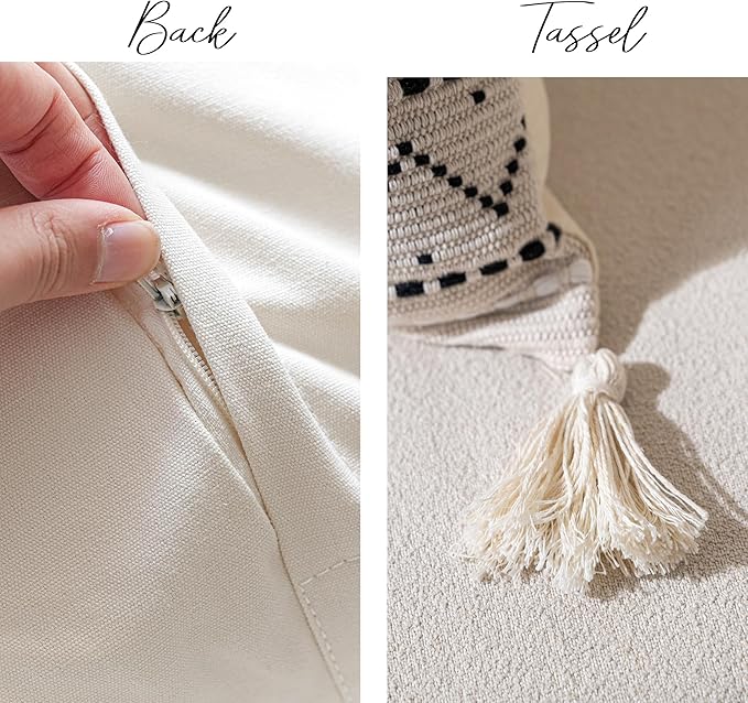 Decorative Throw Pillow Cover 18X18 Square Boho Black Neutral White Accent Pillowcase Tassels Farmhouse Cushion for Couch Sofa Bedroom Living Room Home Décor (Cover ONLY, Pack of 1)