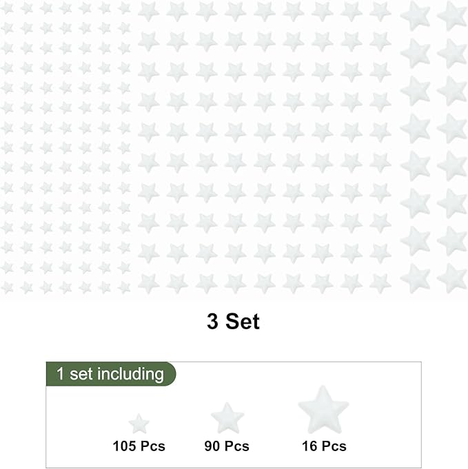 - 3 Set x glow in the dark stickers, 1 set including 16 pcs x 15mm Stars, 90 pcs x 10mm Stars,105 pcs x 5mm Stars,totally 211 pcs,3 Set in total 633 pcs; Color: Blue; Adhesive: self-adhesive; Style: Stars