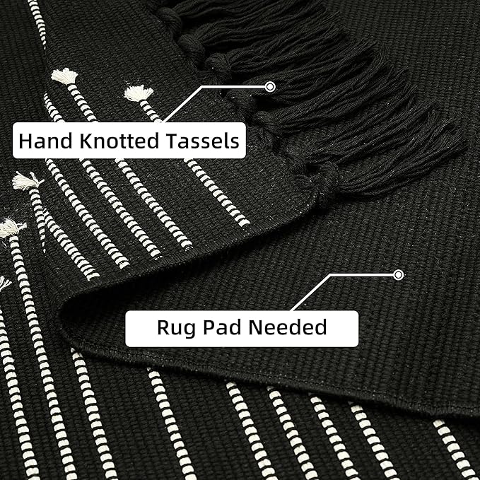 - 🧶Hand Woven Cotton Rugs with Tassels: Elevate your space with this black and white woven cotton rug, featuring knotted tassels that exude Moroccan flair. The intricate tassels add a stylish touch, transforming any room into a beautifully decorated haven with distinctive elegance.