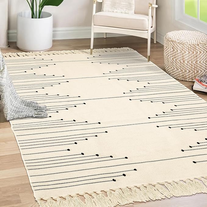 - 🧶Hand Woven Cotton Rugs with Tassels: Elevate your space with this cream white woven cotton rug, featuring knotted tassels that exude Moroccan flair. The intricate tassels add a stylish touch, transforming any room into a beautifully decorated haven with distinctive elegance.