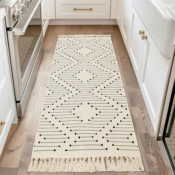 - 📏Size: With a thickness of 0.2 inches, the 2' x 6' (24"x72") bohemian rug is ideal for areas like entryways, hallways, kitchens, bathrooms, front door and small living spaces. NOTE: The 3.9-inch tassels are not included in the rug's total length.