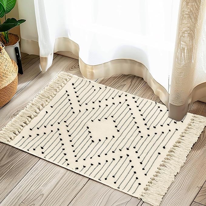 - 📏Size: With a thickness of 0.2 inches, the 2' x 3' (24"x36") bohemian rug is ideal for areas like entryways, kitchens, bathrooms, and small living spaces. NOTE: The 3.9-inch tassels are not included in the rug's total length.