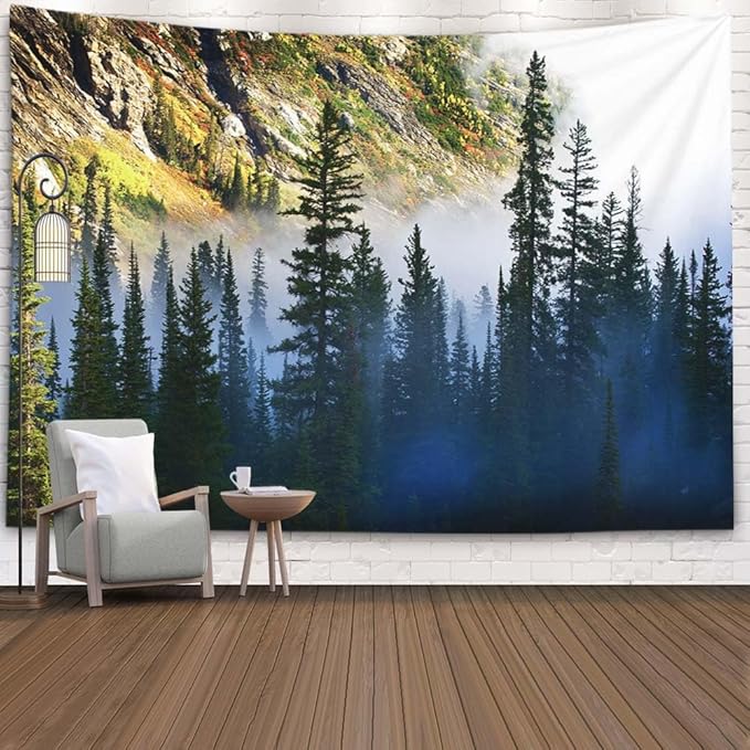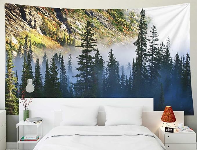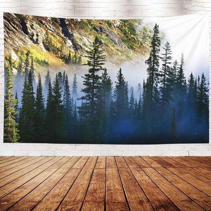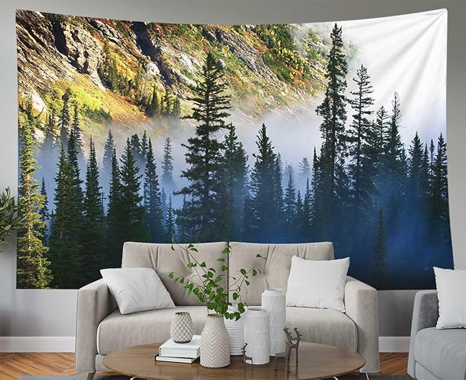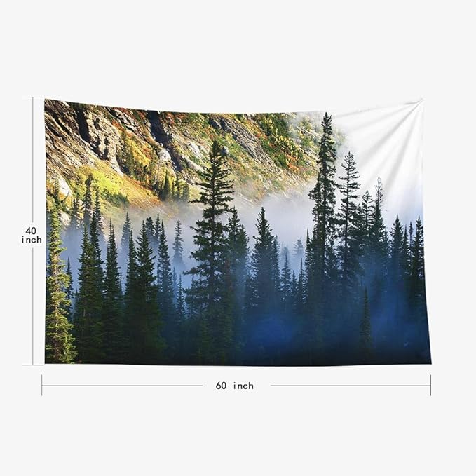 EMMTEEY Landscape Wall Art - Fog and Pine Tree on Rugged Mountainside - 60x40 Hanging Tapestry for Families