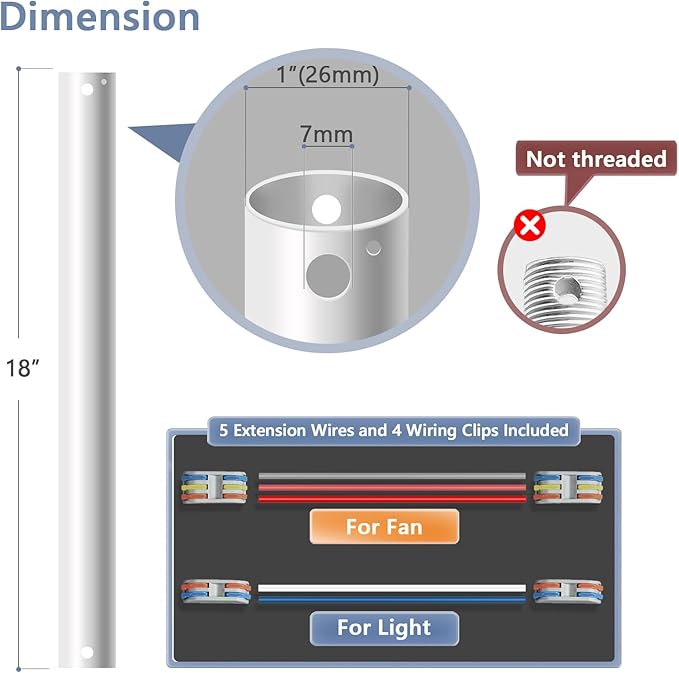 18" Ceiling Fan Downrod, 【1 Outside Diameter】 Matte White Extended Downrod, including 4 Wire Connectors and 5 Extension Wires (No Threads)