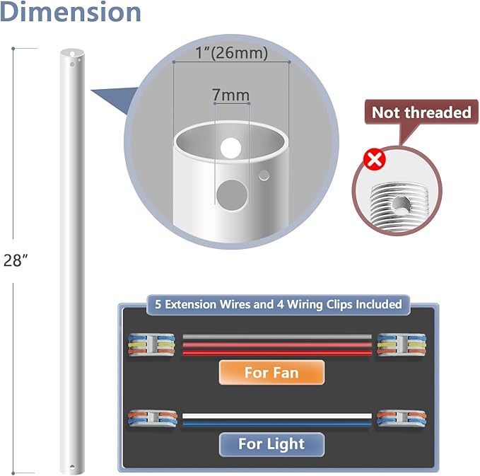 28" Ceiling Fan Downrod, 【1 Outside Diameter】 Matte White Extended Downrod, including 4 Wire Connectors and 5 Extension Wires (No Threads)